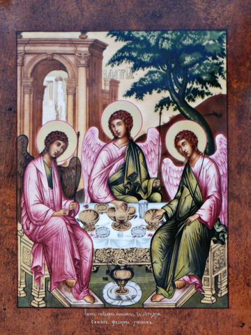 Икона святой троицы андрея рублева и федора ушакова троица. From wikimedia commons, the free media repository.